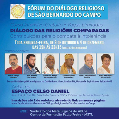 Nesta segunda-feira (09), aconteceu a aula inaugural do curso intensivo Diálogo das Religiões Comparadas, oferecido gratuitamente pelo Fórum do Diálogo Religioso de São Bernardo do Campo, uma proposta pioneira de promoção do conhecimento como ferramenta de combate à intolerância religiosa.