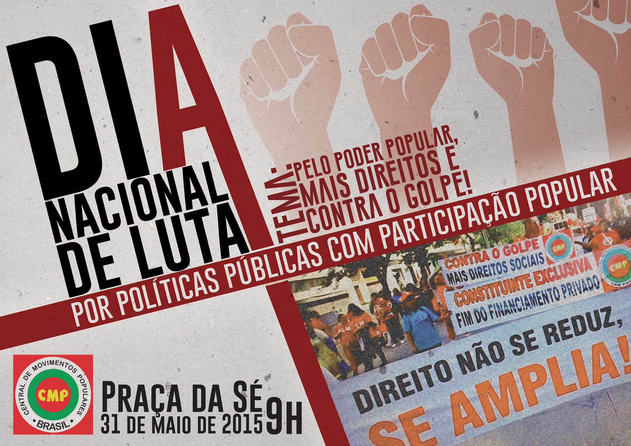 Criado pela CMP - Central de Movimentos Populares, em 31 de maio, acontece o Dia Nacional de Luta por Políticas Públicas com Participação Popular. Neste ano, o tema da atividade é “PELO PODER POPULAR, POR MAIS DIREITOS E CONTRA O GOLPE”.