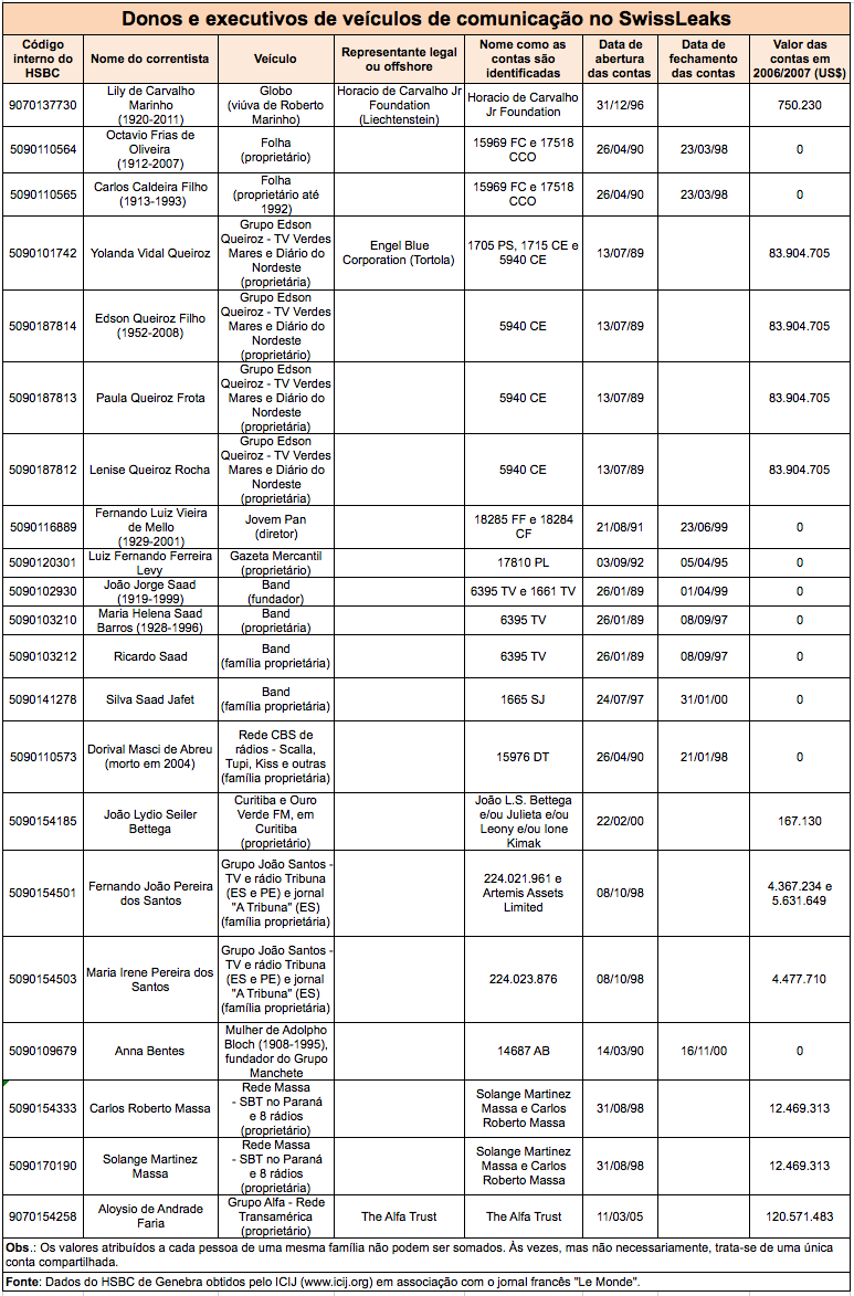 Pelo menos 22 empresários do ramo jornalístico e seus parentes e 7 jornalistas estão na relação dos que mantinham contas na agência do HSBC em Genebra, na Suíça, em 2006/2007.